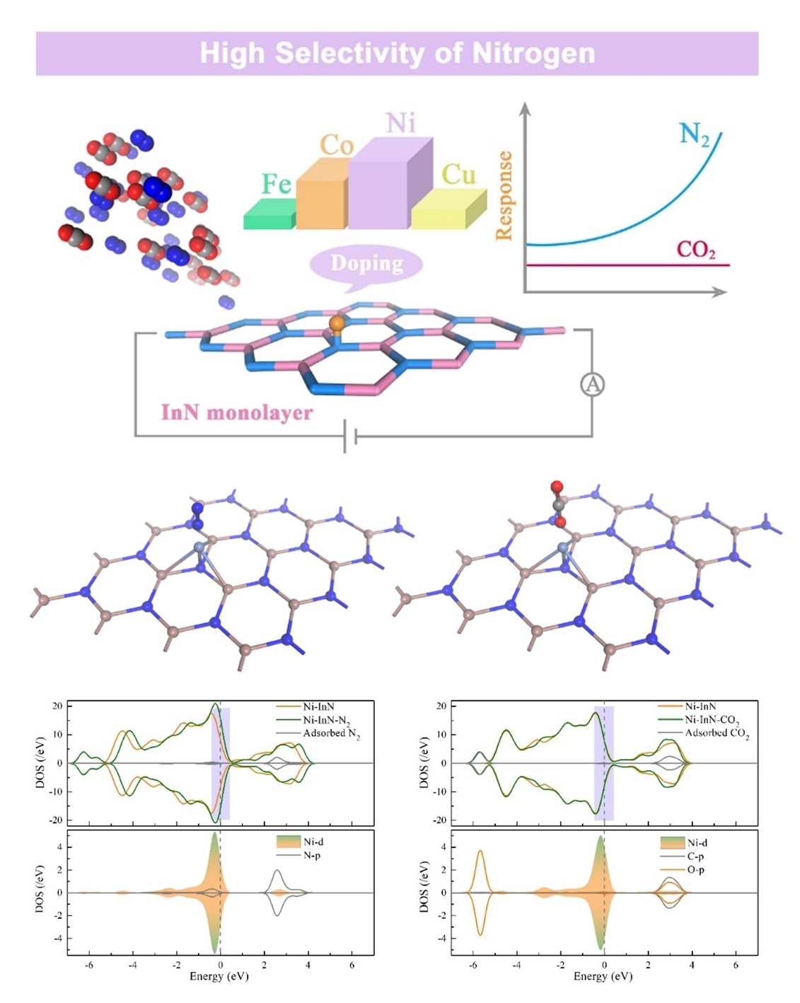 选择性差是气体传感器面临的普遍问题。特别是当二元混合气体共吸附时,每种气体的电响应贡献不能被合理的分配。本文以CO 2和N 2为例,利用密度泛函理论揭示了过渡金属(Fe, Co, Ni, Cu)修饰的InN单层的选择性吸附机理(图1)。结果表明,与纯InN单层相比,Ni修饰提高InN单层的导电性,表现出与N 2更强的亲和力。该工作首次强调了态密度在描述电响应上的重要性,Ni修饰的InN单层实现了对N 2的单一电响应,消除了CO 2的干扰(图2)。此外,d带中心理论解释了Ni原子在气体吸附性能中优于Fe、Co和Cu原子的原因。该研究为揭示气体敏感材料的高选择性机理提供了新的视角。