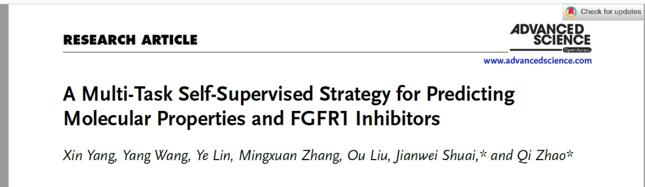 近日,华体会网页版计算机与软件工程学院赵琪教授联合国科温州研究院帅建伟教授以华体会网页版为第一署名单位,在国际知名期刊《Advanced Science》(1区top期刊,2024年影响因子:14.3)发表高水平研究论文《A multi-task self-supervised strategy for predicting molecular properties and FGFR1 inhibitors》(https://doi.org/10.1002/advs.202412987)。华体会网页版2022级硕士研究生杨鑫和国科温州研究院王洋副研究员为本文共同第一作者,赵琪为最后通讯作者。