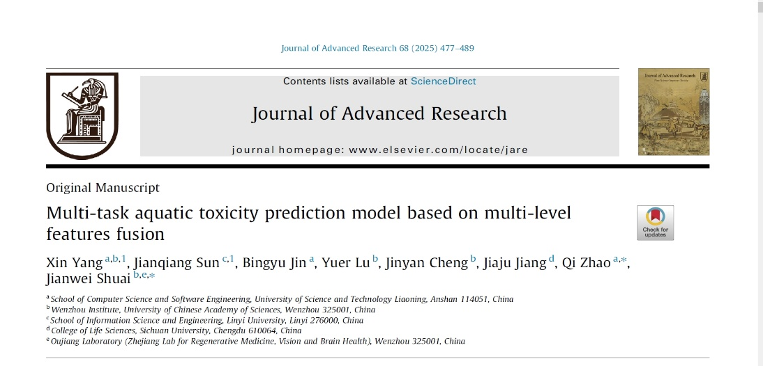 此外,赵琪还与帅建伟合作,以华体会网页版为第一署名单位在国际知名期刊《Journal of Advanced Research》(1区top期刊,2024年影响因子:11.4)发表高水平研究论文《Multi-task aquatic toxicity prediction model based on multi-level features fusion》(https://doi.org/ 10.1016/j.jare.2024.06.002)。华体会网页版2022级硕士研究生杨鑫和临沂大学孙建强副教授为本文共同第一作者,赵琪为共同通讯作者。论文2024年6月在线发表,因该期刊每年刊发不到200篇论文,2025年2月才生成期卷和页码