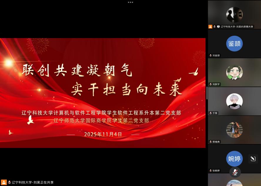 为进一步强化高校基层党组织建设,搭建跨校党建经验交流平台,凝聚青年党员奋进力量,11月4日,华体会网页版计算机与软件工程学院学生软件工程系升本第二党支部与辽宁师范大学国际商学院学生第二党支部 “云端” 相聚,联合举办 “联创共建凝朝气、实干担当向未来” 主题活动。华体会网页版计算机与软件工程学院学生软件工程系升本第二党支部书记刘昊、辽宁师范大学国际商学院学生第二党支部书记于兴扬,及两个支部全体学生党员共同参与。