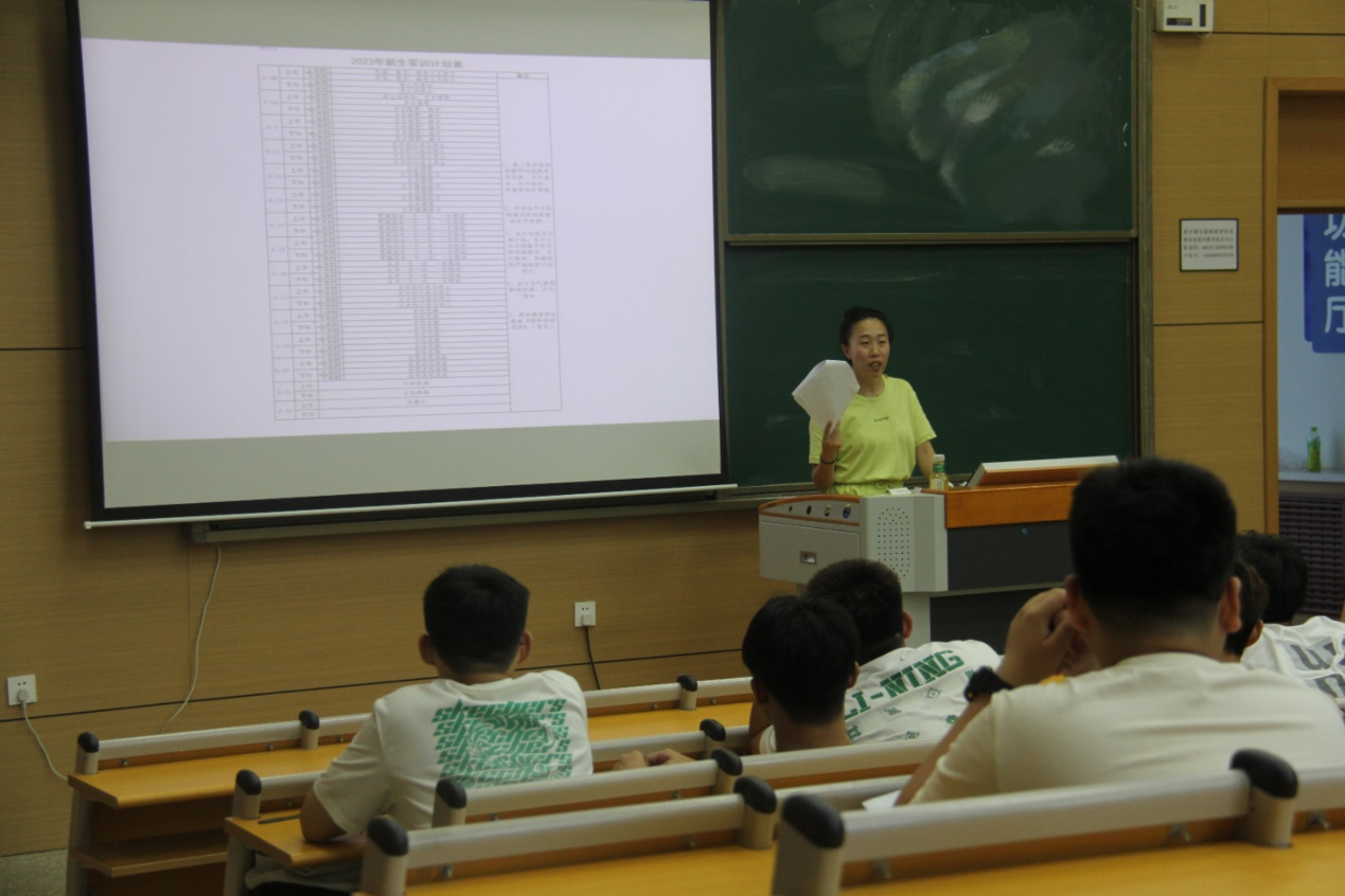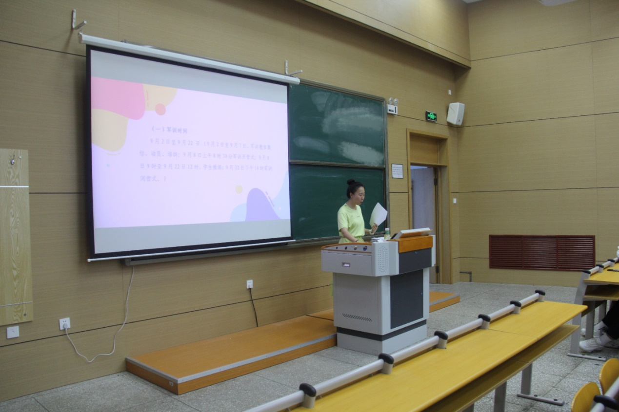 辅导员张翀睿明确军训时间安排和请假等相关事宜,就军训期间作息时间安排以及军训中应注意的问题着重进行了强调,并提出三点要求:第一、端正态度,认真对待军训,刻苦训练;第二、严守纪律,听从管理指挥,学习军人优良作风;第三、树立安全意识,确保军训期间的人身安全。