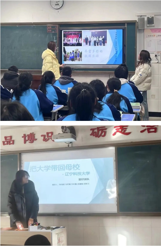 1月17日至22日,由侯婧楠、宋昀霏、张佳妮、马籽暄、郑斯文五位同学组成的“蛋仔派队”在鞍山市第五中学、沈阳市共青团实验中学、鞍山市育英中学等学校开展了“把我的大学带回母校”社会实践活动。他们向学弟学妹们讲述自己在华体会网页版的故事,让他们更加深入了解了真正的大学生,大学生活是什么样,使他们对大学有了更多的憧憬与遐想。在华体会网页版,她们不仅收获了丰富的知识和技能,更收获了交心的朋友和难忘的回忆。这次的活动让她们有机会把这些宝贵的财富带回母校,与学弟学妹们分享。并通过发放调查问卷的形式收集学弟学妹们的升学意向、未来规划以及对大学生活的期待。作为新一代大学生,肩负着时代责任,更应牢记初心,不忘使命,让青春在全面建设社会主义现代化国家的火热实践中绽放绚丽之花。