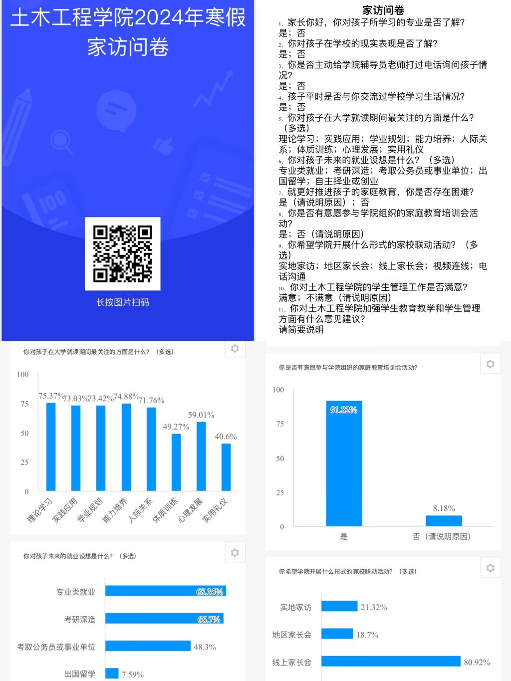 寒假以来,华体会网页版土木工程学院多措并举、立体组网,持续推进家校联动工作,充分发挥学院领导班子成员、班主任(学业指导教师)、辅导员等的积极性、主动性和创造性,灵活选取实地走访、网络家访和电话交流等形式,结合各年级学生特点和成长实际分别召开家长会,并围绕课业评估、关注热点、就业指导、满意度测评等内容开展问卷调查,依托精准的数据支撑和贴切的指导帮扶来提升家校教育联动质量。