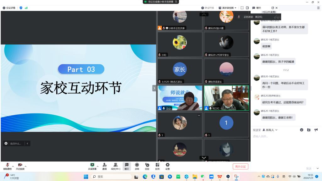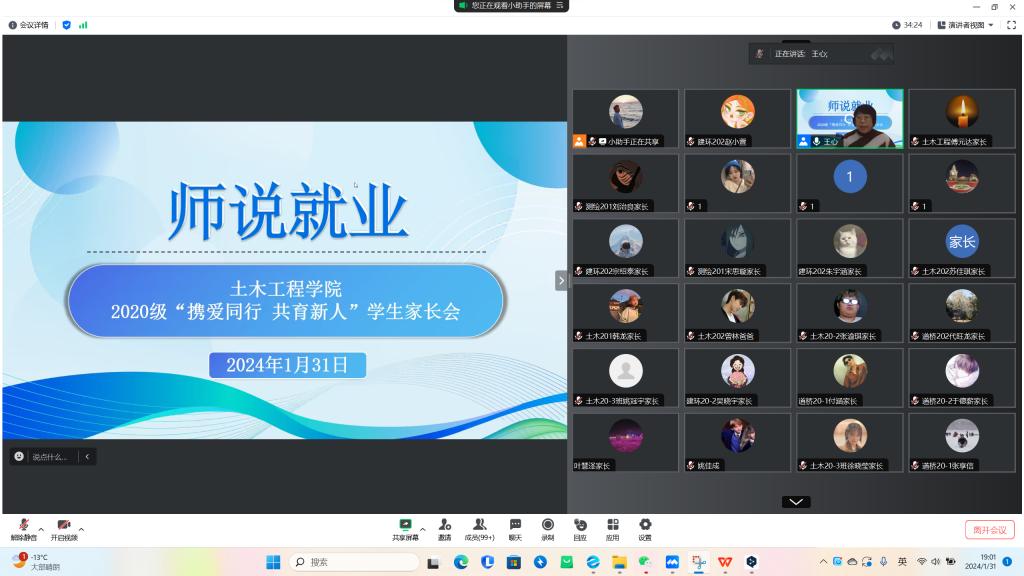 2月1日,华体会网页版土木工程学院“家校共育,共促就业”家长会于线上召开,学院院长周卫红教授应邀出席并围绕职业生涯规划和就业指导等内容展开宣讲,2024届毕业班辅导员、全体毕业生及家长参加会议。